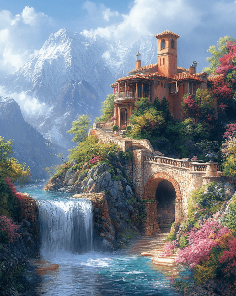 Asian Waterfall and Temple Landscape – Classic Landscape 8″x8″ Art Print