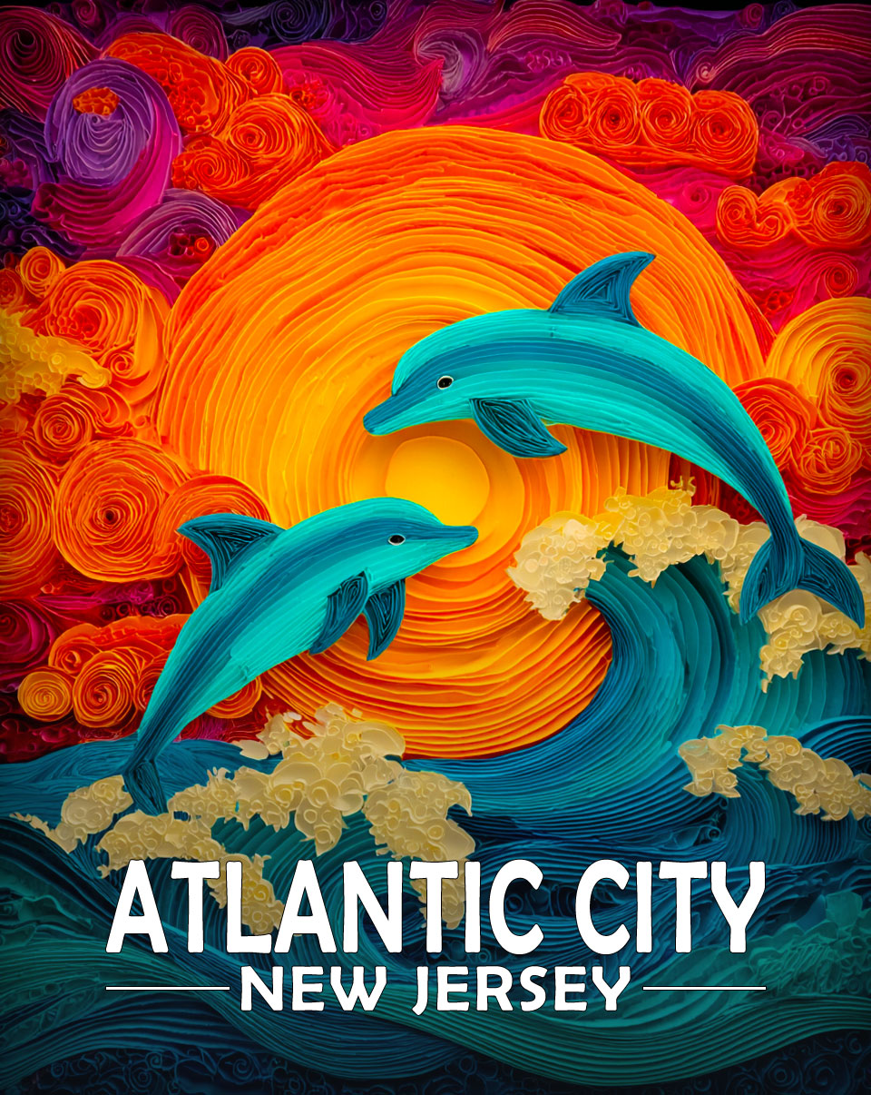 Atlantic City, New Jersey Souvenir Art Print – Stylized Dolphins Jumping at Sunset