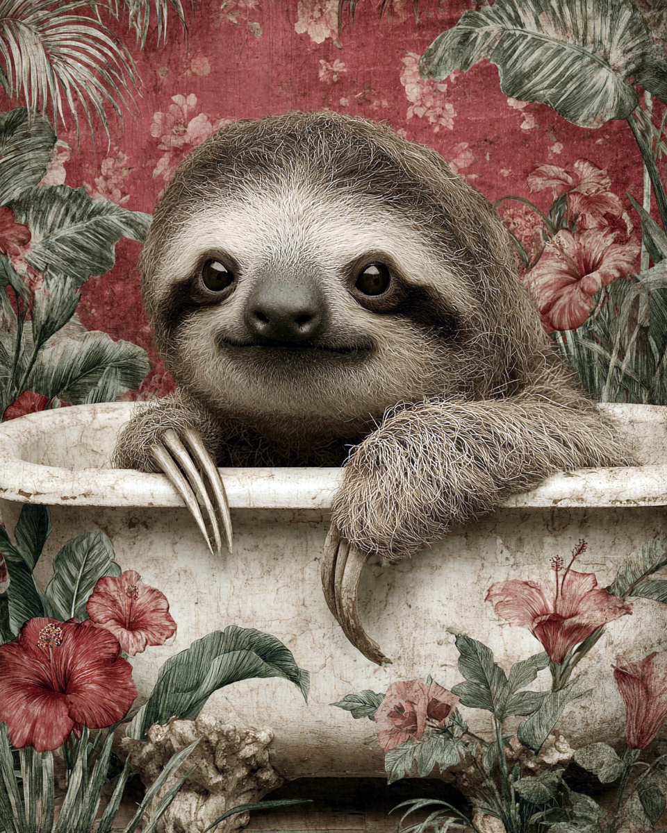 Baby Sloth in Floral Bathtub – Whimsical Bathroom Decor