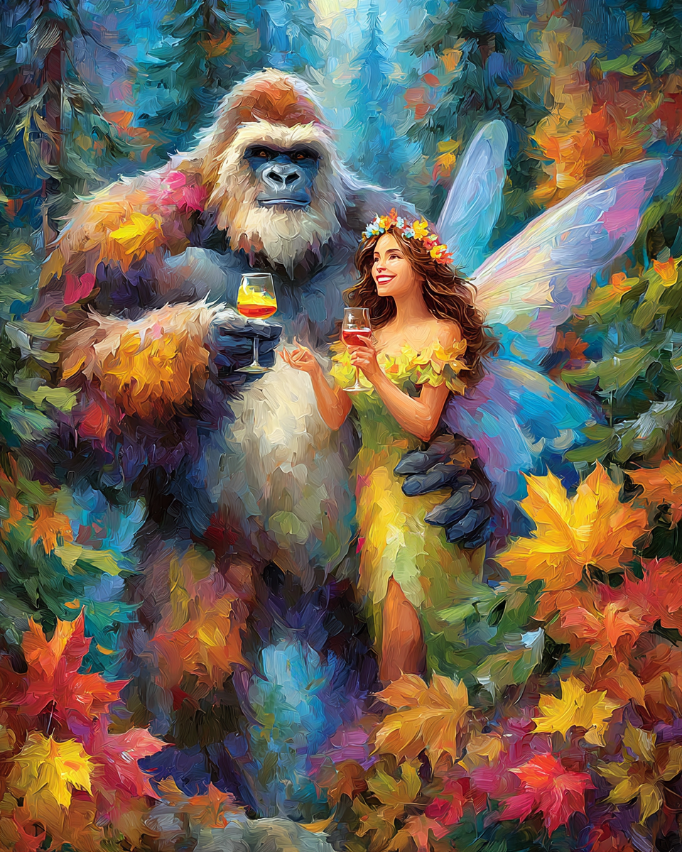 Bigfoot Enjoying Wine with a Fairy – Art Prints of Fairies