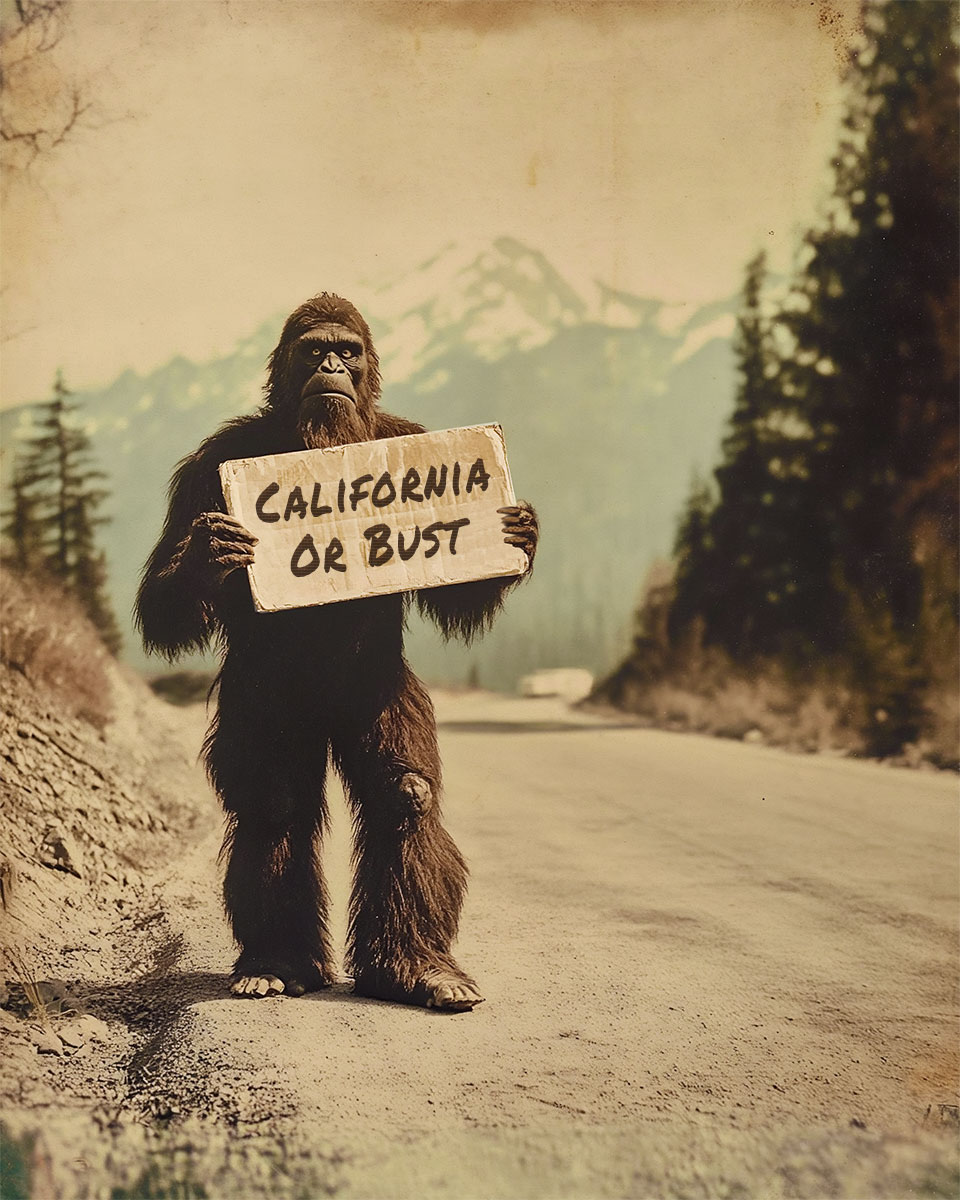 Bigfoot Hitchhiking to California on a Mountain Road