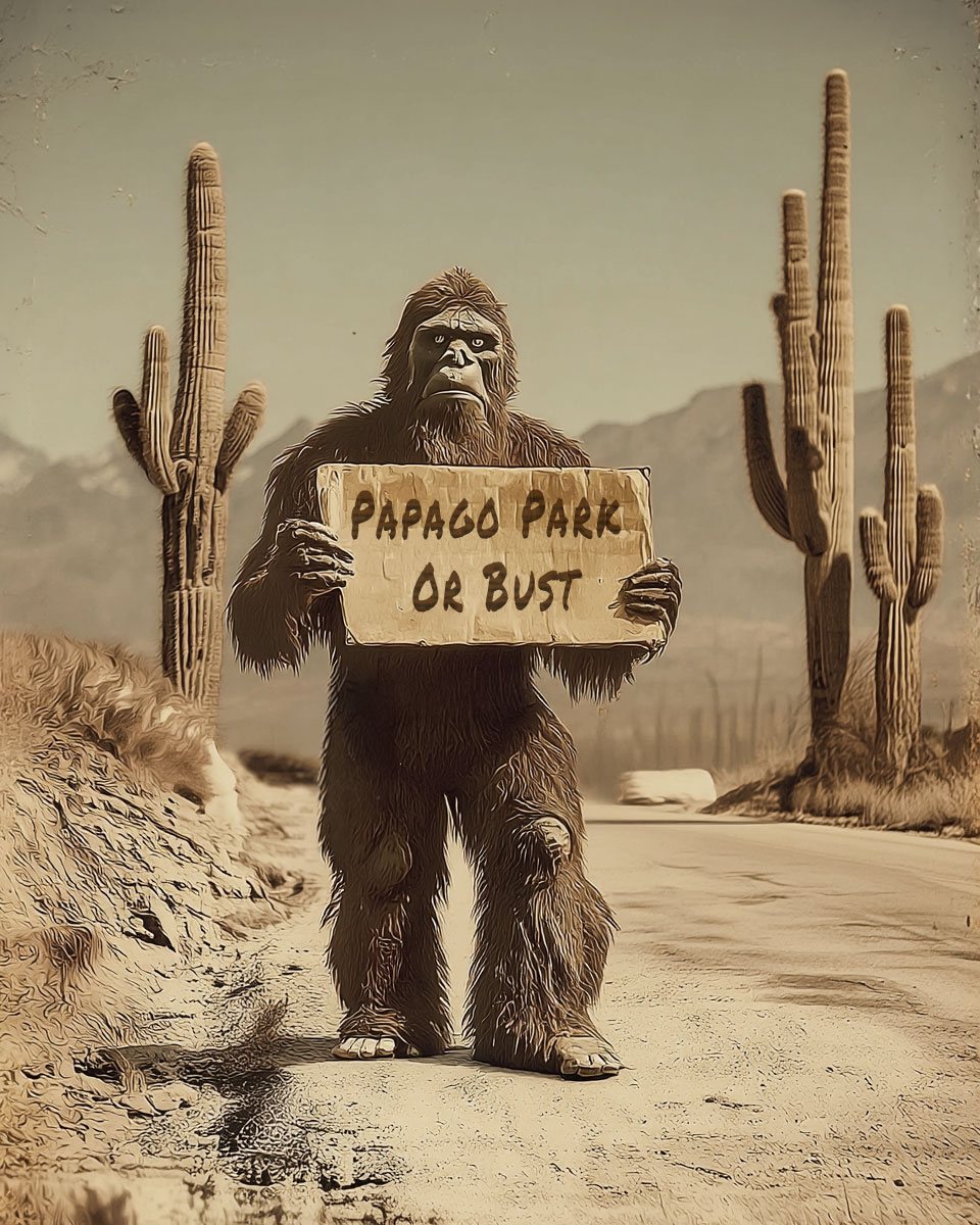 Bigfoot Hitchhiking to Papago Park on a Desert Road