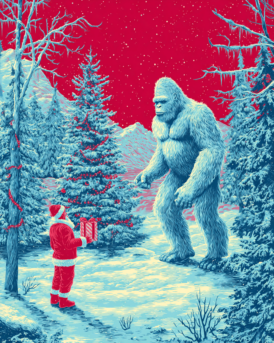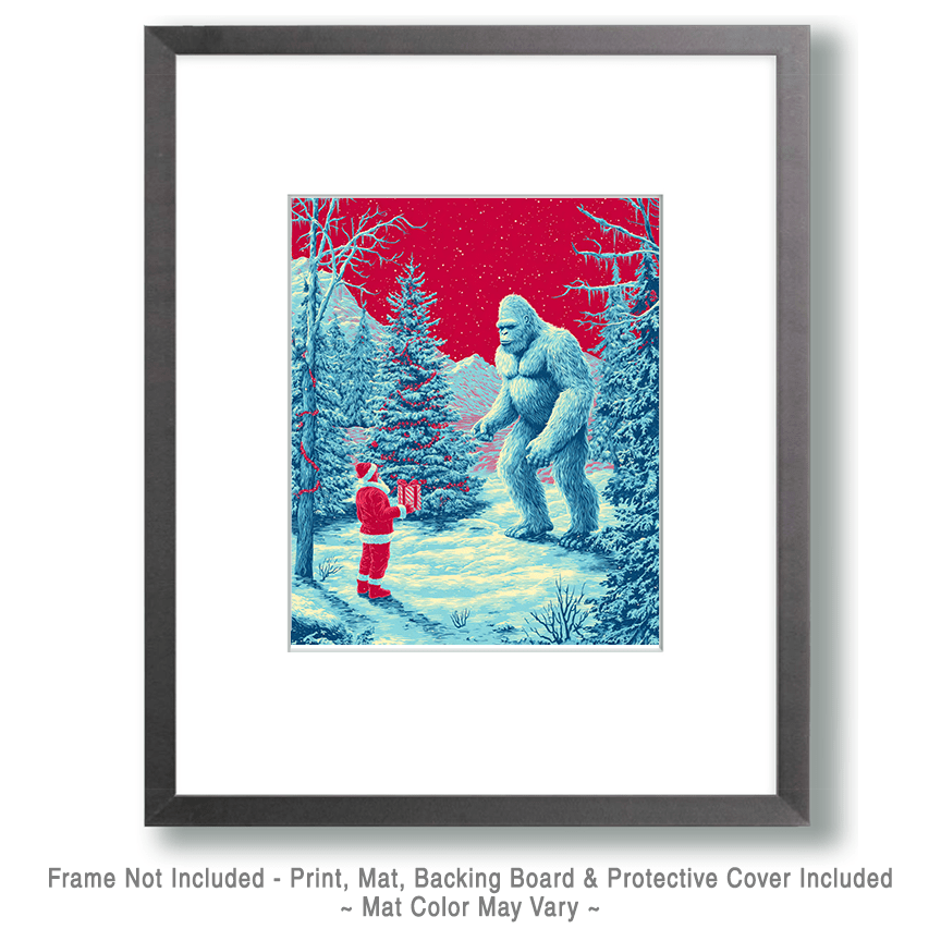 Wall Art Prints of Bigfoot as Santa Claus sell well because they combine the playful mystery of the beloved cryptid Sasquatch with the festive charm of Christmas. This quirky fusion creates a humorous and unexpected twist on traditional X-mas décor, appealing to both Bigfoot fans and holiday enthusiasts alike.