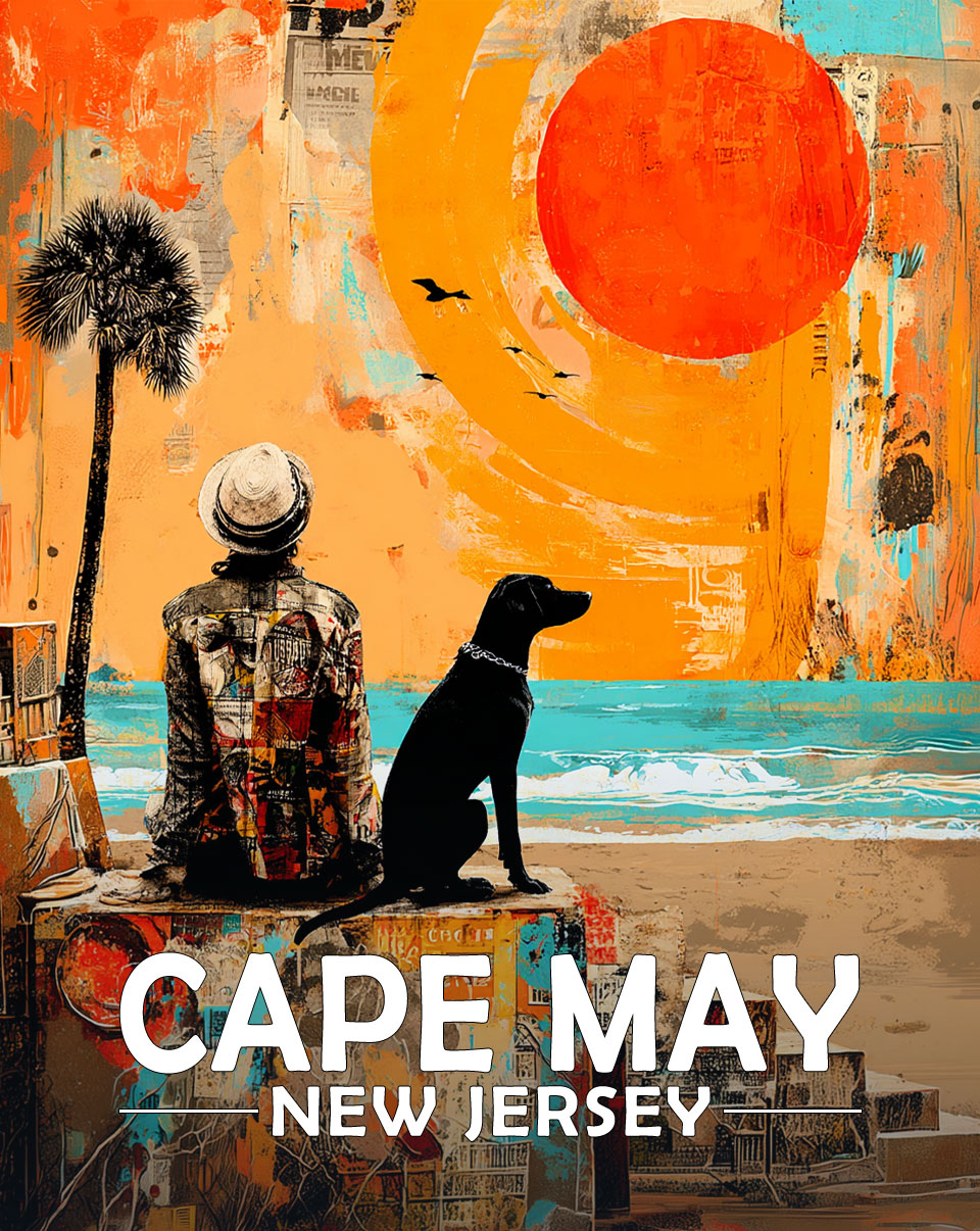 Cape May, New Jersey Souvenir Art Print – Man and Dog Enjoy the Sunrise on the Beach