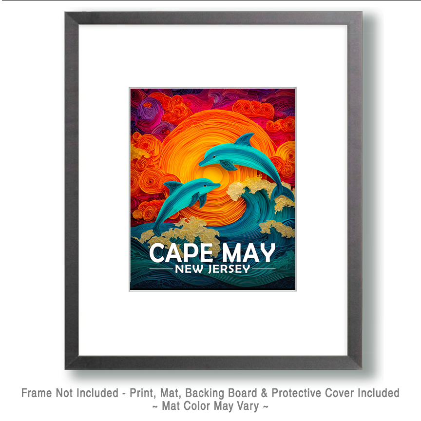 Cape May, New Jersey Souvenir Art Print – Stylized Dolphins Jumping at Sunset