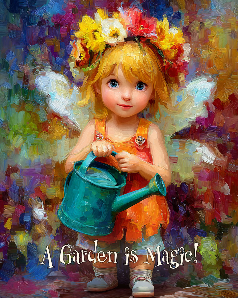 Daisy Daffodil Watering Her Flowers – A Garden is Magic – Faires Art Print