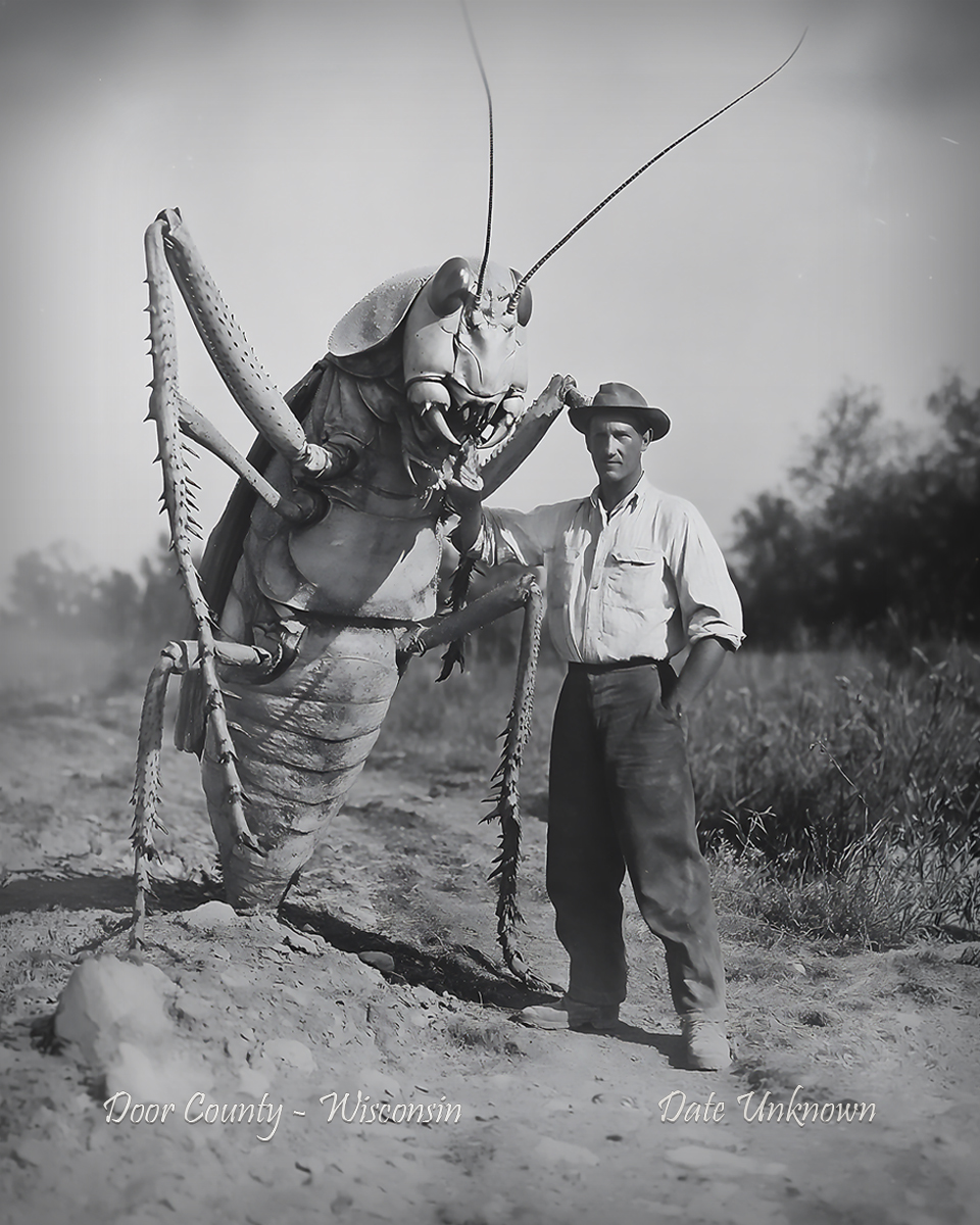 Door County, Wisconsin – Standing by Giant Grasshopper – Vintage Style Agriculture Cryptid Photo