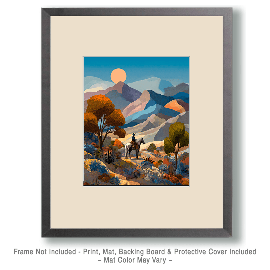 Artwork of the American Southwest blends beautifully with a variety of home décor styles that emphasize warmth, texture, and natural beauty. In Southwestern and desert modern interiors, the earthy color palettes of red rock, terracotta, and turquoise echo the landscapes of the region. Rustic and farmhouse styles also pair well, as weathered wood, stone, and woven textiles enhance the rugged frontier character often found in cowboy or pueblo-inspired art. For bohemian and eclectic homes, Southwestern prints bring in bold geometric patterns, cultural motifs, and vibrant desert hues that add personality and depth. Even in modern minimalist spaces, a striking Southwestern landscape or silhouette of a cowboy or cowgirl can serve as a dramatic focal point, grounding the room with warmth and regional flair.