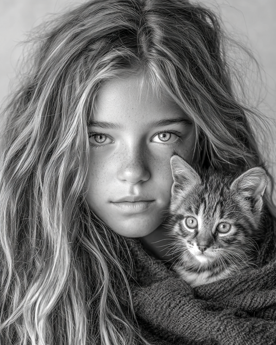 Art prints featuring a black and white portrait of a girl and her kitten pair beautifully with elegant interior styles such as vintage home decor, modern farmhouse decor, and minimalist wall decor, where soft neutral palettes and classic imagery create a calm, timeless atmosphere. The emotional simplicity of black and white photography wall art allows it to blend effortlessly with Scandinavian decor, cottagecore decor, and classic portrait wall art, making it an appealing focal piece for living rooms, bedrooms, and cozy reading spaces. Shoppers frequently search for cat wall art, girl and kitten art, black and white animal art, and cat lover decor, making this style of artwork especially attractive to customers looking for meaningful, heartwarming imagery.