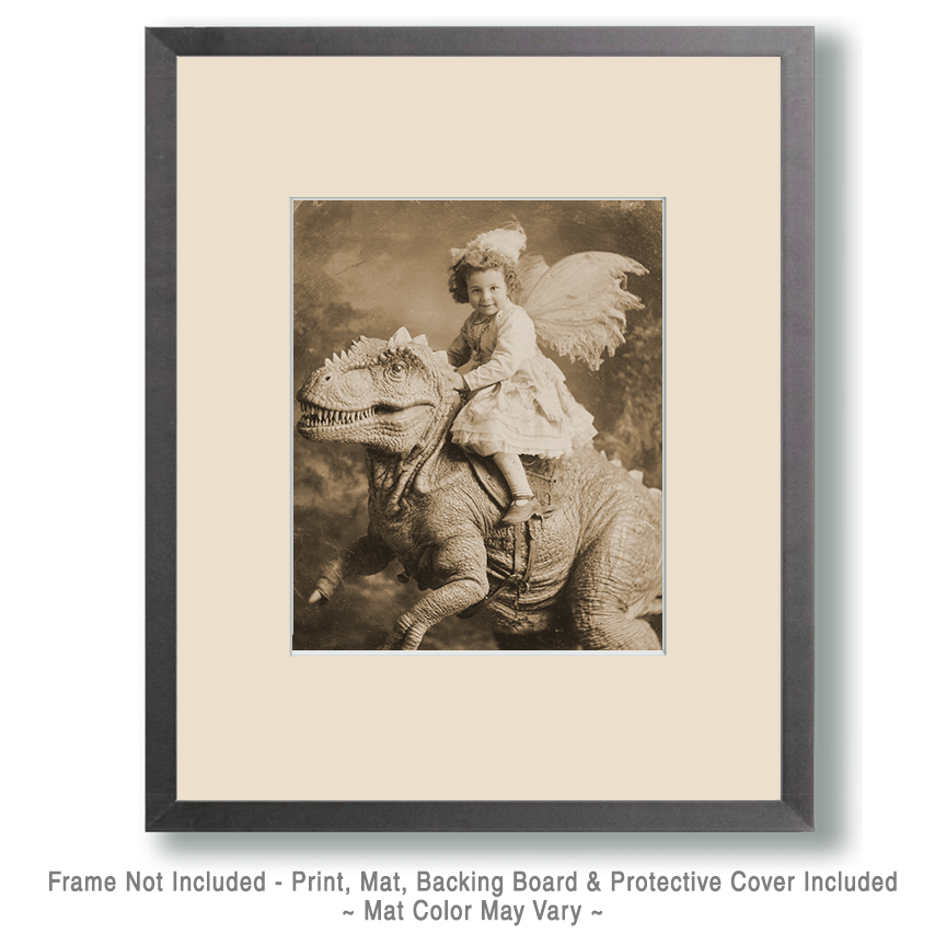 Fairy Riding a T-Rex Dinosaur – Antique Style Photo – Fairies Home Decor Wall Art