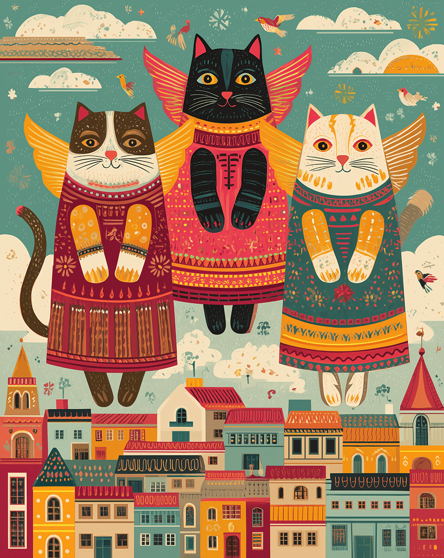 Art prints featuring angel cats in a folk art style offer a whimsical and charming blend of celestial and rustic aesthetics. These pieces often depict felines with delicate, feathery wings, haloed in gold or soft light, and set against backdrops of simplified, stylized landscapes or cozy domestic scenes. The folk art influence is evident in the flattened perspective, bold outlines, and a vibrant, often primary, color palette. The naive, almost childlike, quality of the drawing gives these prints a heartwarming and accessible feel, celebrating the mythic grace and gentle spirit often associated with cats in a manner that is both endearing and uniquely artistic.