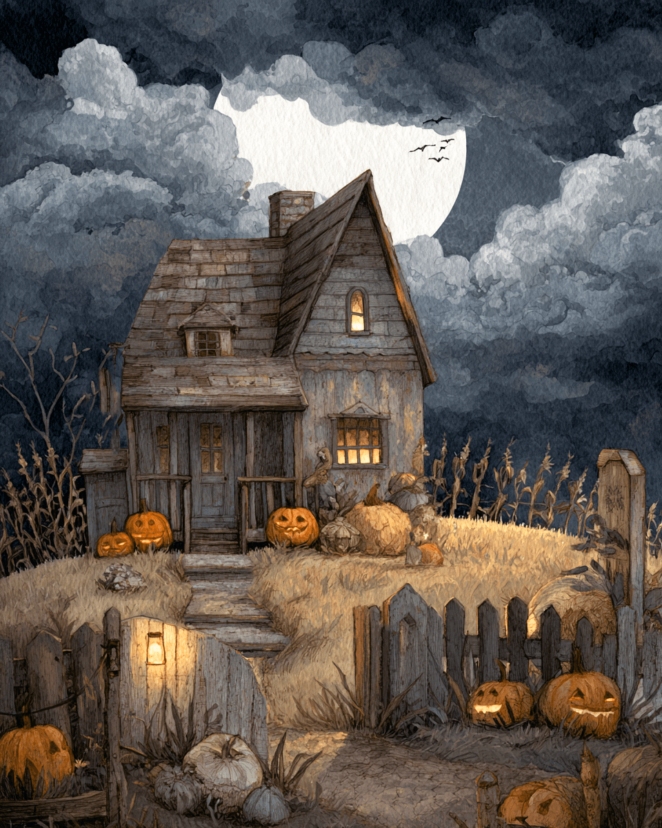 Folk Art House on Hallows Eve Dark Academia Art Print – 8″x10″ Artwork for 11″x14″ Frame
