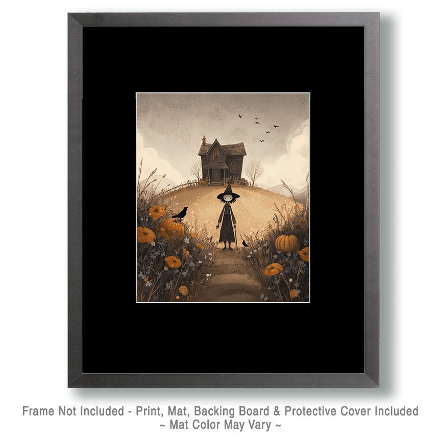 Folk Art Style Witch in Front of Her House Goth Home Decor Wall Art