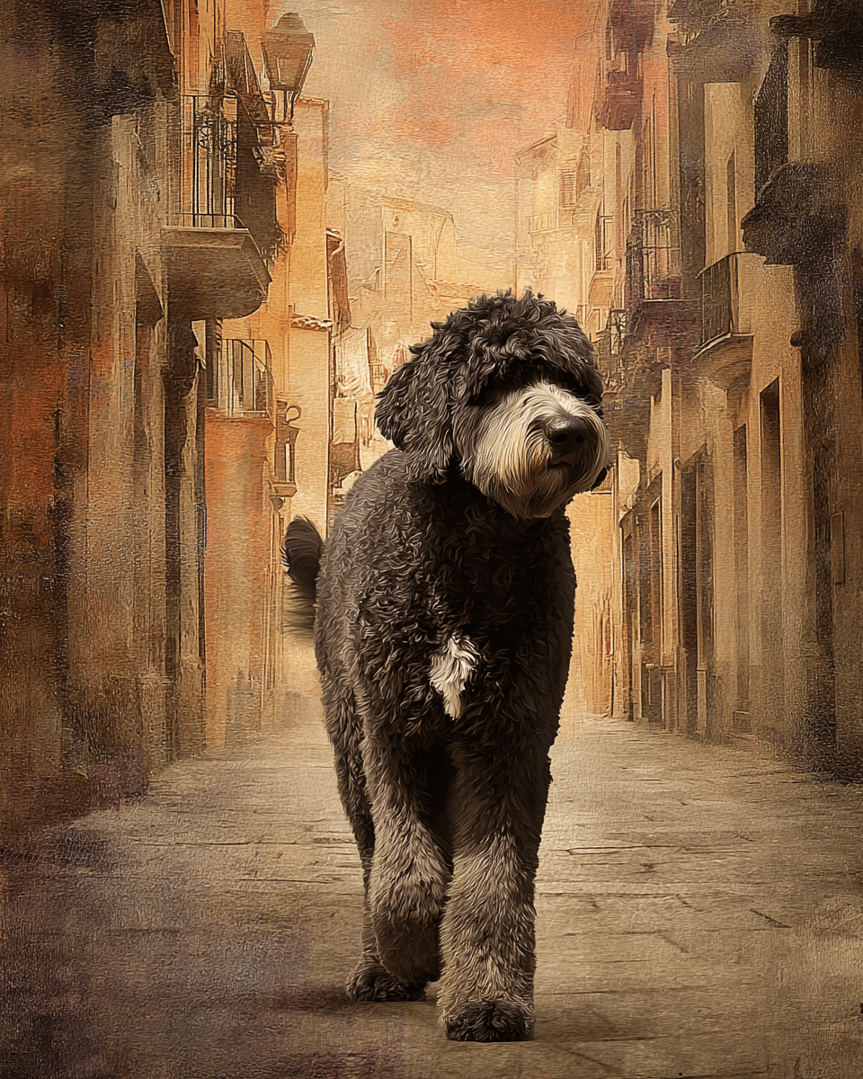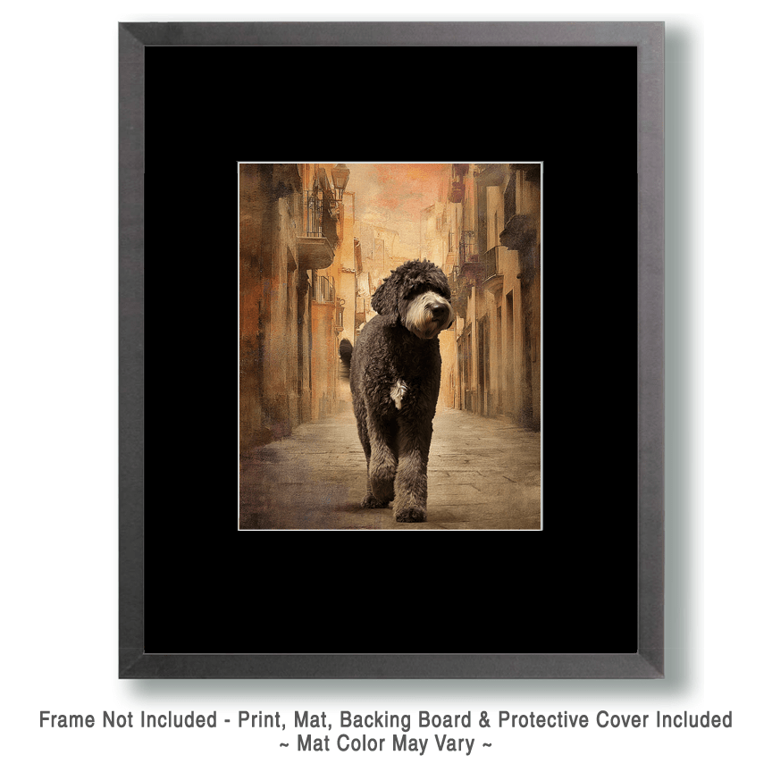 Giant Portie Walking Down City Street – Portuguese Water Dog Home Decor Wall Art