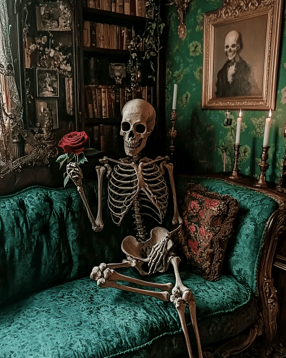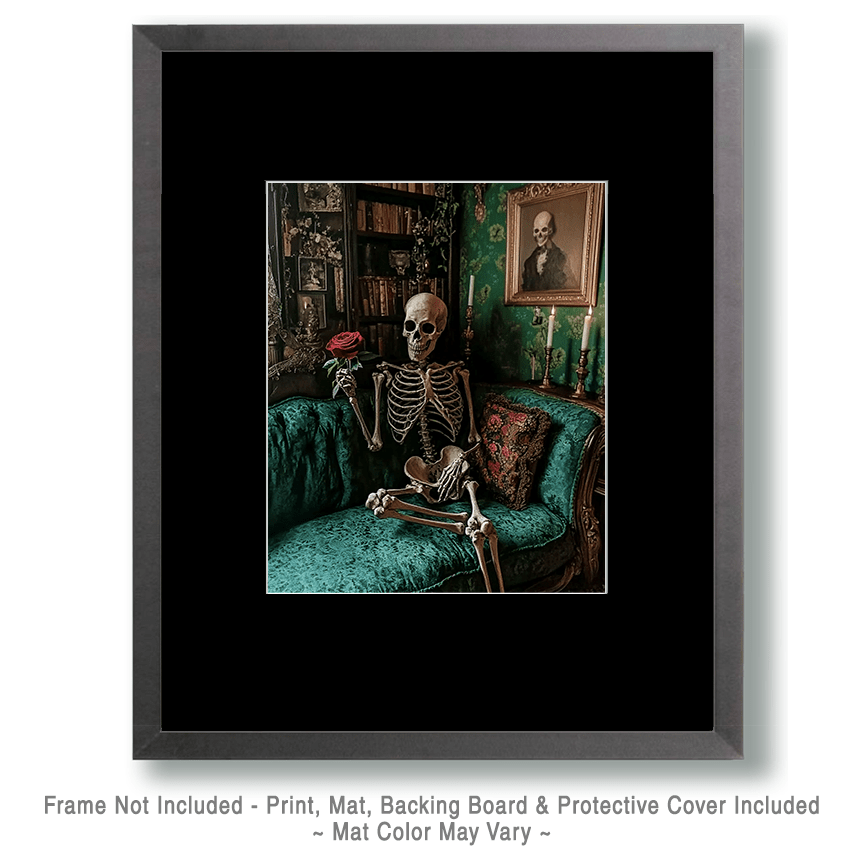 Goth Skeleton on Chaise Lounge Admiring a Rose- Gothic Home Decor Wall Art