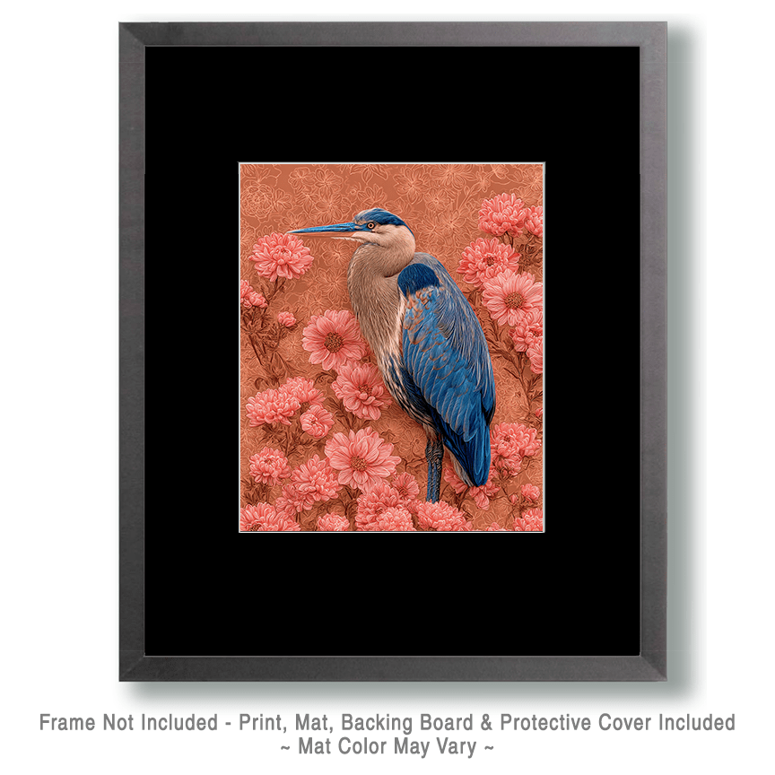 Great Blue Heron Among Flowers – American Wildlife Home Decor Wall Art
