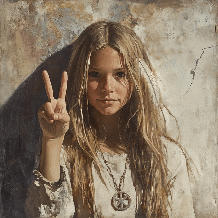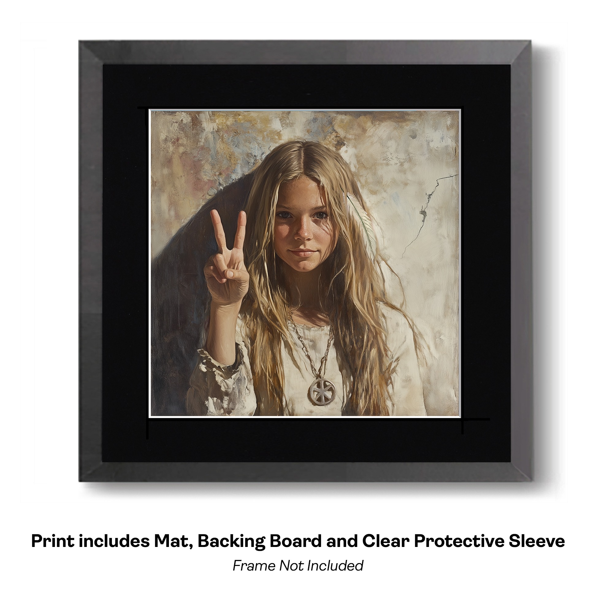 Hippie Girl Giving Peace Sign Art Print – 8″x8″ Artwork for 12″x12″ Frame