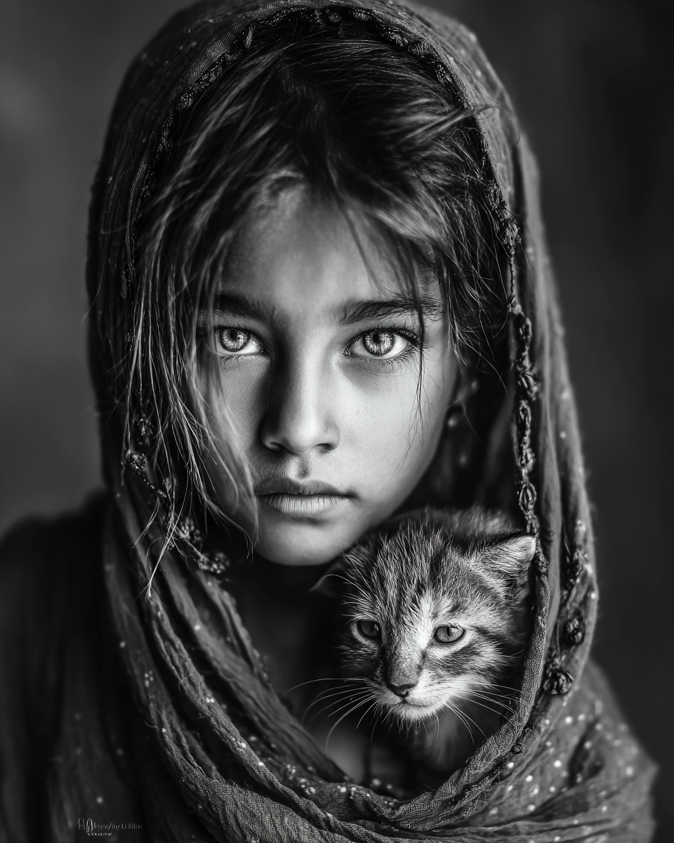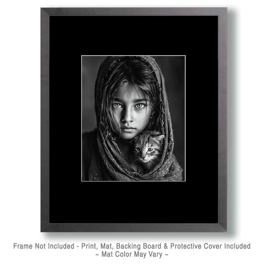 Art prints featuring a black and white portrait of a girl and her kitten pair beautifully with elegant interior styles such as vintage home decor, modern farmhouse decor, and minimalist wall decor, where soft neutral palettes and classic imagery create a calm, timeless atmosphere. The emotional simplicity of black and white photography wall art allows it to blend effortlessly with Scandinavian decor, cottagecore decor, and classic portrait wall art, making it an appealing focal piece for living rooms, bedrooms, and cozy reading spaces. Shoppers frequently search for cat wall art, girl and kitten art, black and white animal art, and cat lover decor, making this style of artwork especially attractive to customers looking for meaningful, heartwarming imagery.