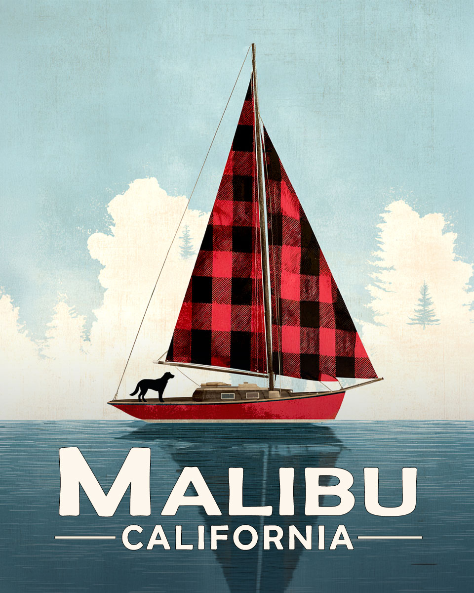 Malibu California Souvenir Art Print – Buffalo Plaid Sailboat