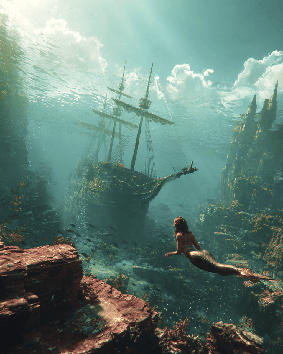 Mermaid and Sunken Ship Surrealism Ocean Theme Home Decor Wall Art