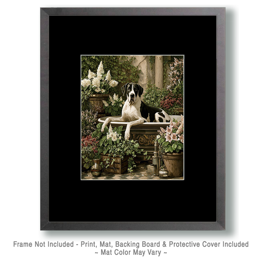 Art prints of a Great Dane in a Bathtub fit perfectly with playful interior styles such as dog-themed home decor, fun bathroom decor, and whimsical wall art, where lighthearted imagery adds personality and charm to a space. The oversized personality of the Great Dane combined with a humorous bathtub scene makes it especially appealing for bathroom wall decor, pet lover decor, and funny animal wall art, creating a conversation-starting focal point. Shoppers frequently search for Great Dane wall art, funny dog art, dog lover gifts, and cute dog decor, making this type of artwork an easy sell for retailers looking to offer joyful, pet-inspired home accents.