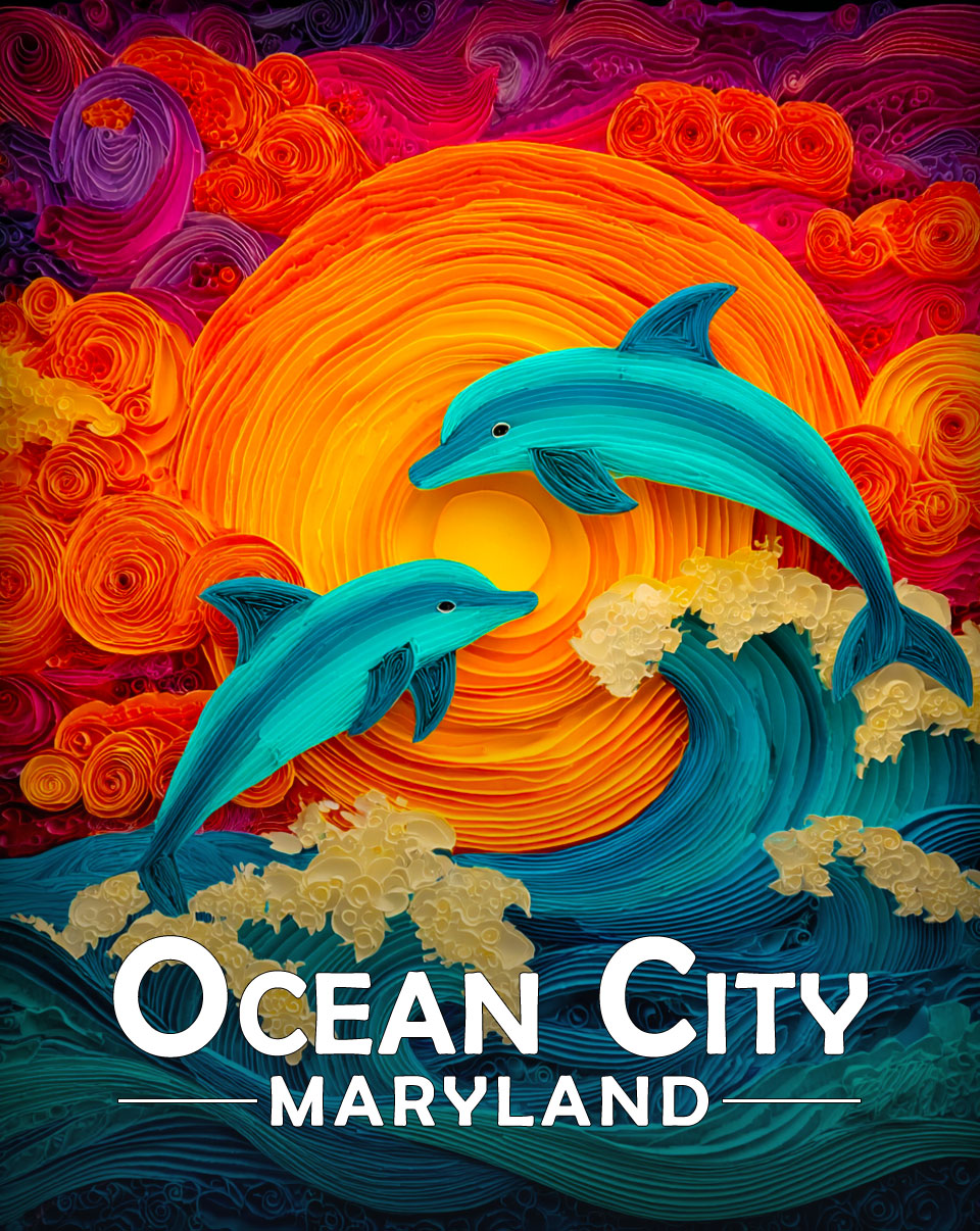 Ocean City, Maryland Souvenir Art Print – Stylized Dolphins Jumping at Sunset