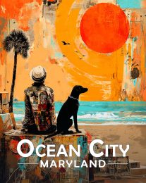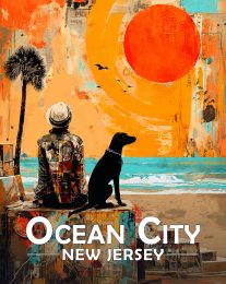 Ocean City, New Jersey Souvenir Art Print – Man and Dog Enjoy the Sunrise on the Beach