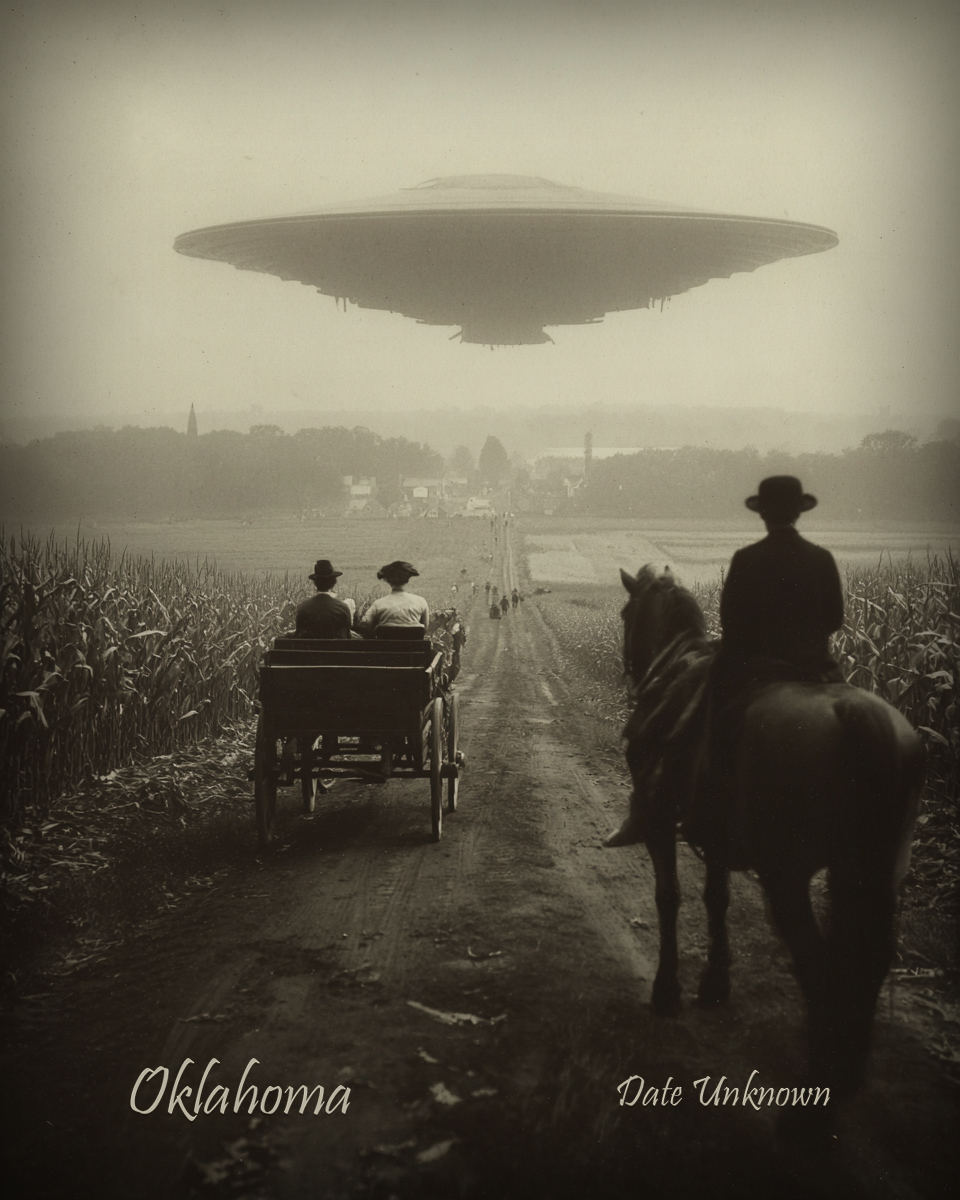 Oklahoma – Alien Flying Saucer Over Town – Vintage Style Agriculture Cryptid Photo