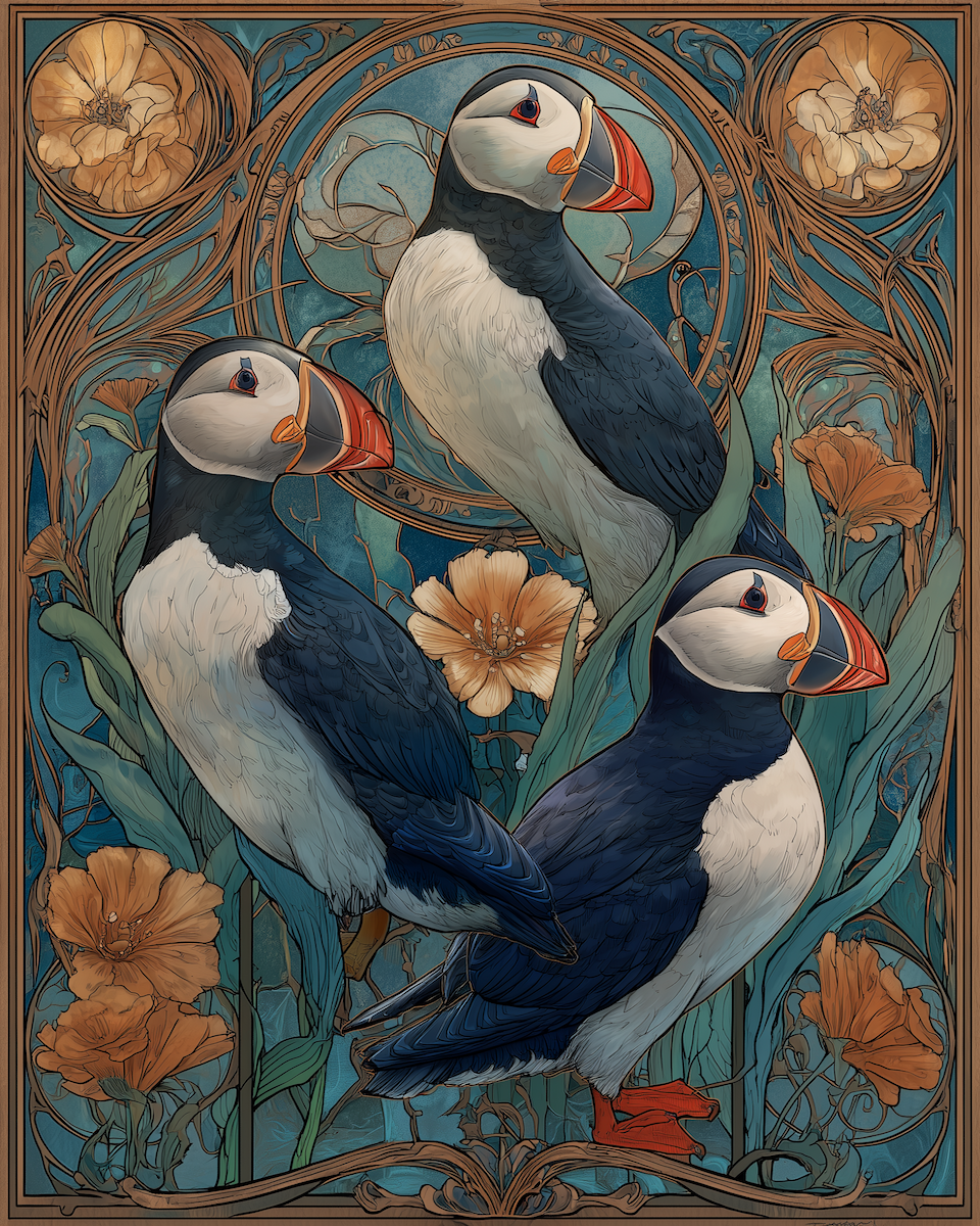 Plucky Art Nouveau Puffins – Plucky Puffins 16 Art Print 12″- 8″x10″ Artwork