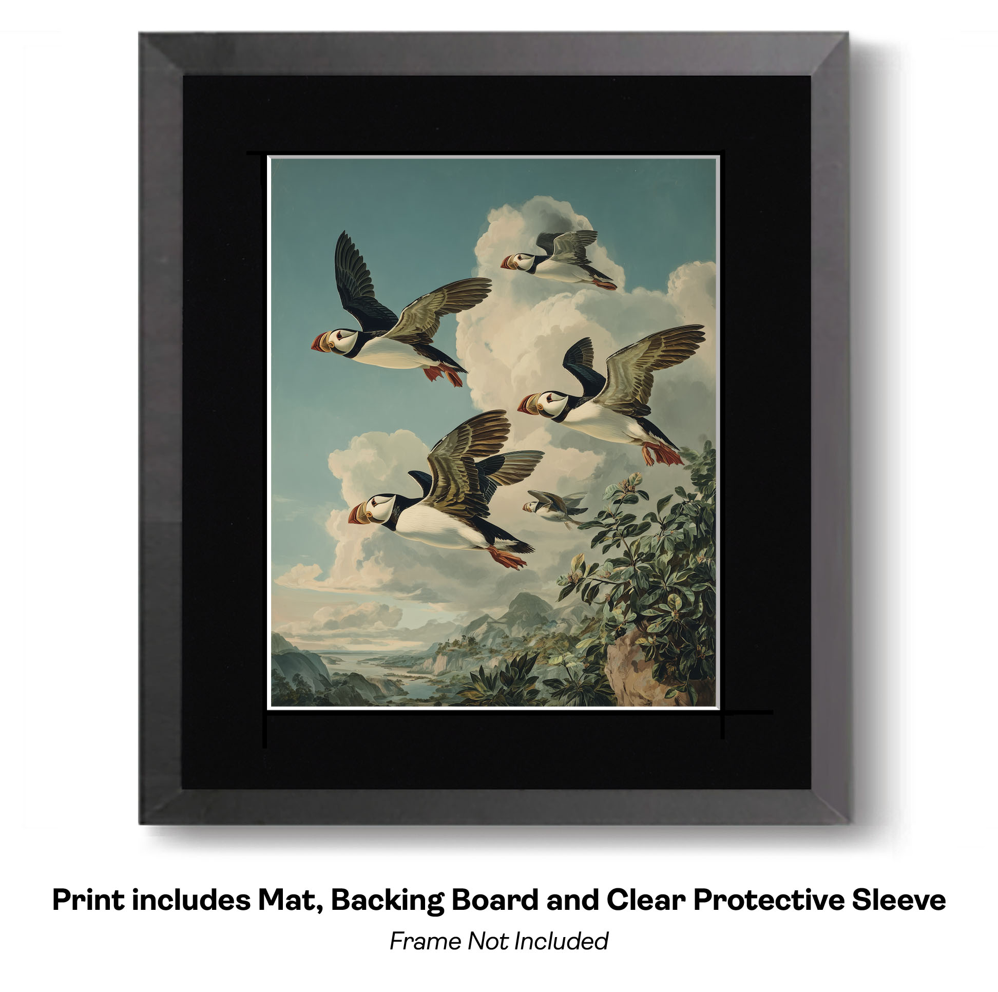 Our puffin prints are thoughtfully packaged to ensure they arrive in retail-ready condition, combining aesthetic appeal with archival-quality protection. Each print comes professionally matted, providing a clean, crisp border that draws the eye toward the vibrant details of the artwork while preventing the image from touching the glass once framed. To ensure structural integrity, every piece is paired with a sturdy backboard, preventing any bending or warping during display or storage. Finally, each assembly is housed in a clear protective sleeve, offering a crystal-clear view of the puffin while shielding it from dust, fingerprints, and moisture.