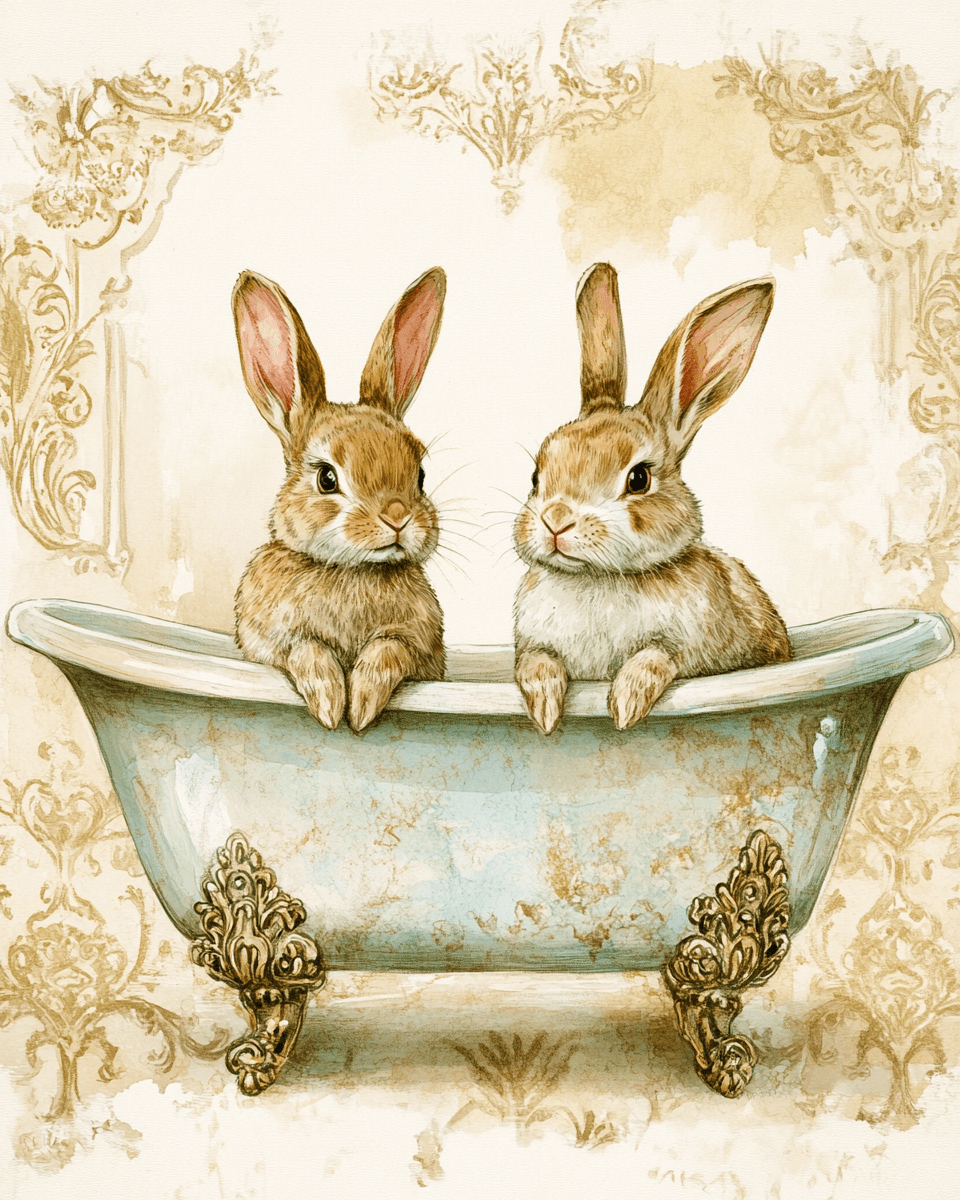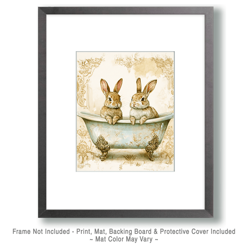 Rabbit Babies in Antique Bathtub – Bathroom Wall Art Prints – 8″x10″ Artwork for 11″x14″ Frame