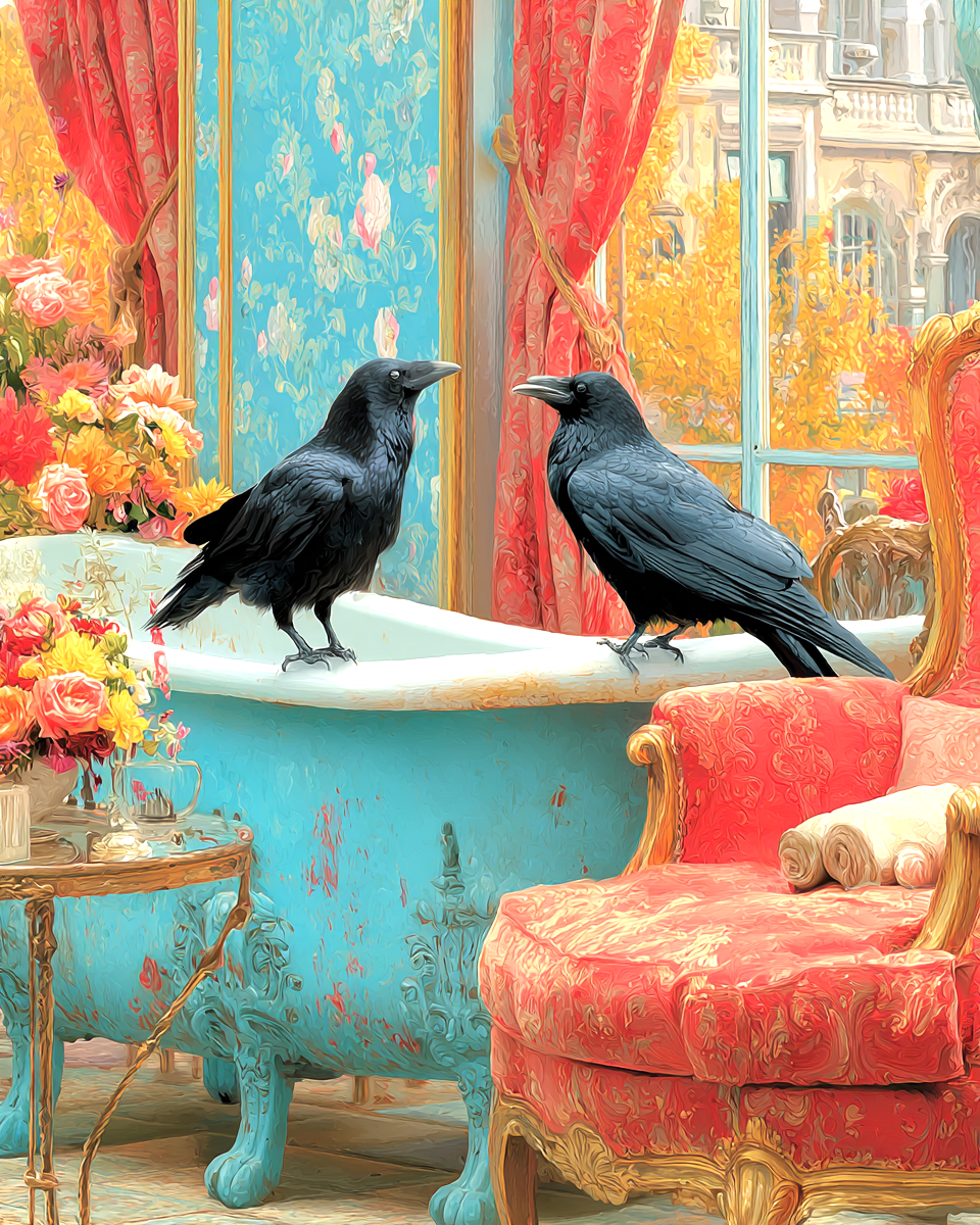 Ravens on a Bathtub by a Window – Funny Bathroom Art Print