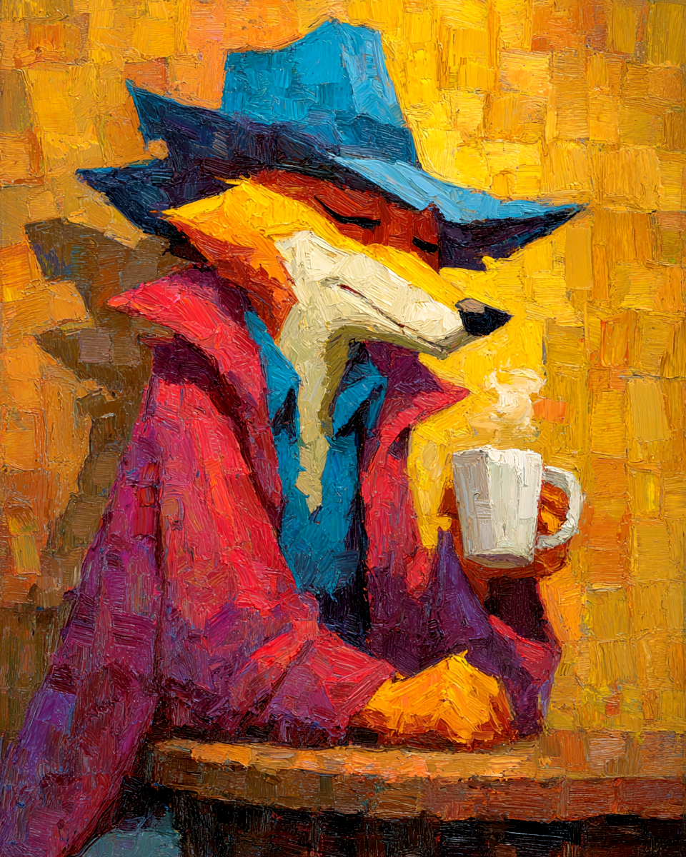 Red Fox with Morning Coffee Anthropomorphic Home Decor Wall Art