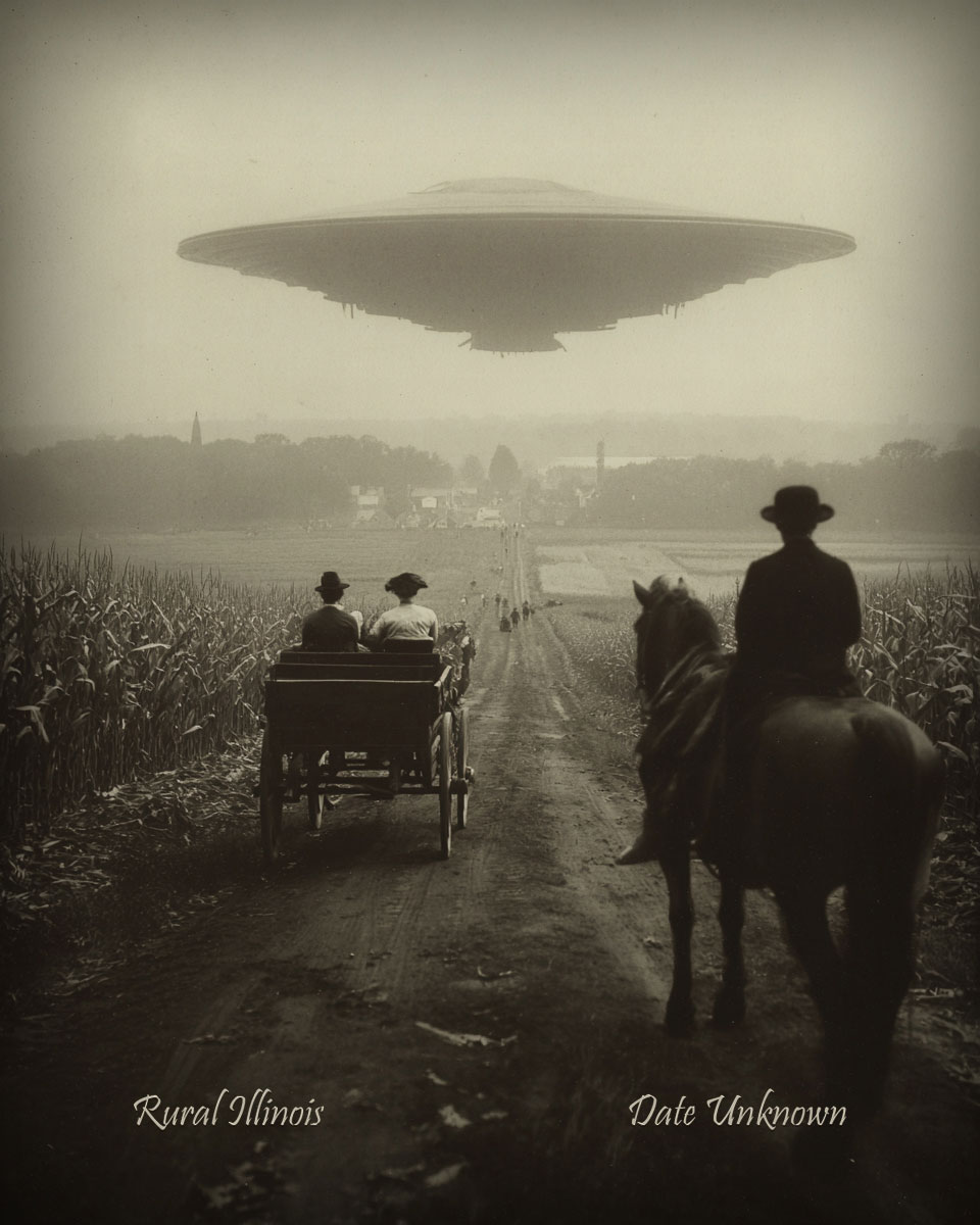 Rural Illinois – Alien Flying Saucer Over Town – Vintage Style Agriculture Cryptid Photo