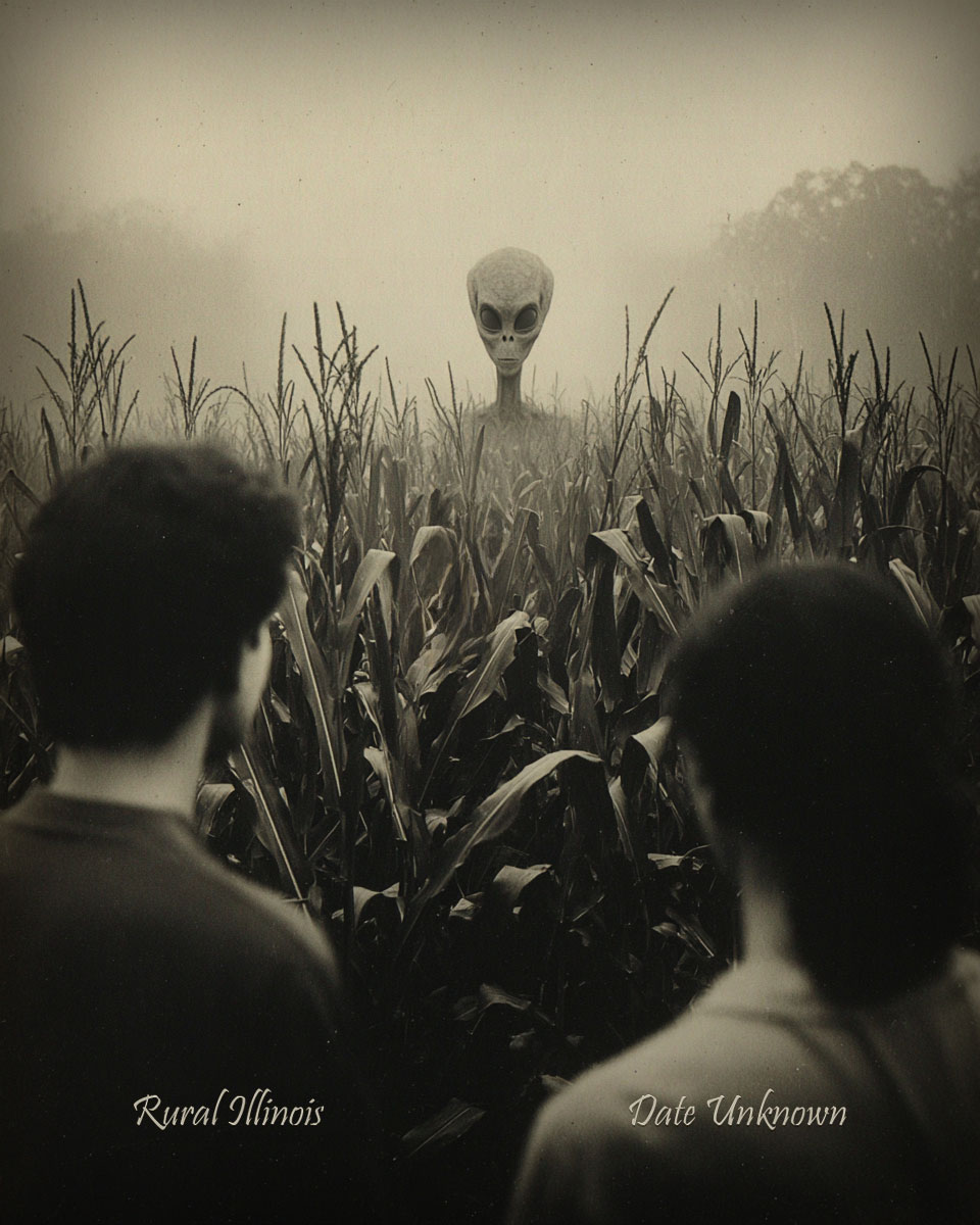 Rural Illinois – Alien Pops Up – Vintage Style Agriculture Cryptid Photo