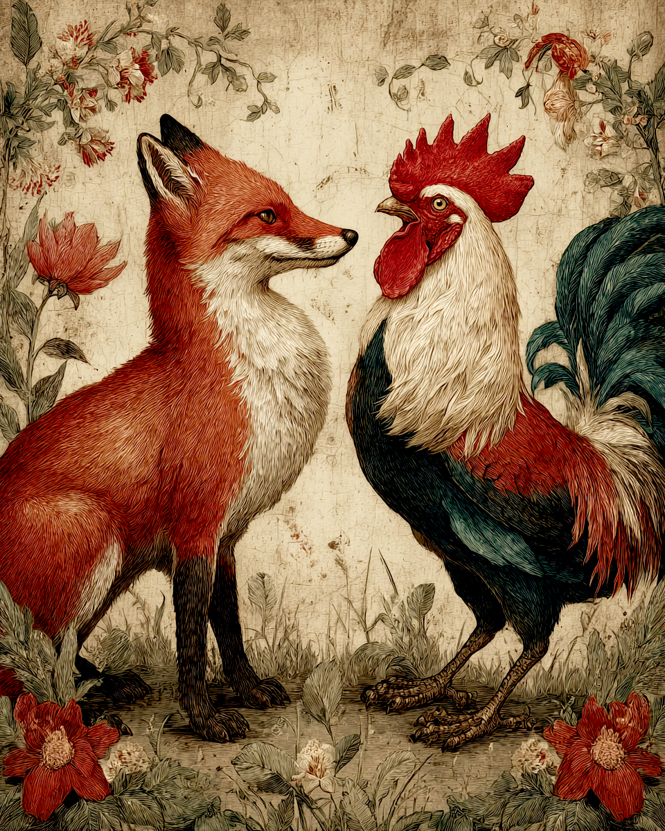 Rustic Timid Fox and Bold Rooster – Farm Life Wall Art Prints