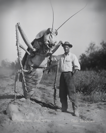 Shipshewana, Indiana – Standing by Giant Grasshopper – Vintage Style Agriculture Cryptid Photo