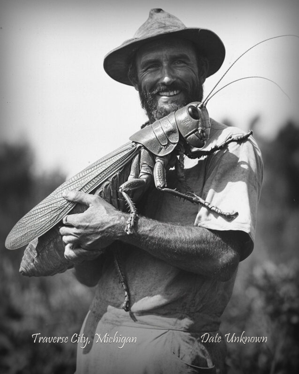 Traverse City, Michigan – Holding Giant Grasshopper – Vintage Style Agriculture Cryptid Photo