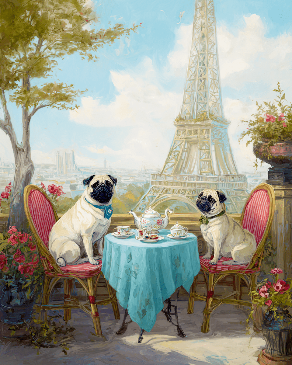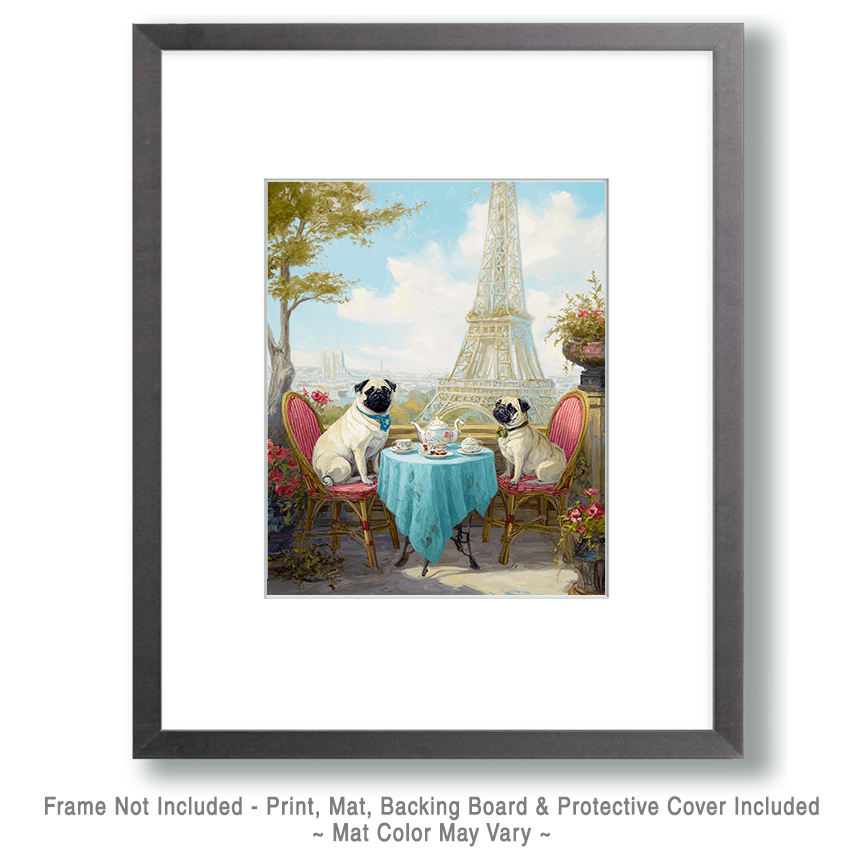 Two Pugs Having Tea at a Paris Cafe Dog Themed Home Decor Wall Art