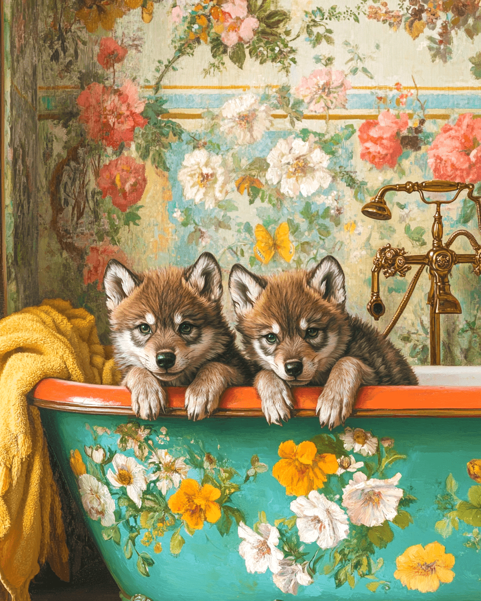 Wolf Cubs in an Antique Bathtub – Bathtub Wall Art Prints
